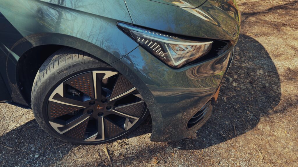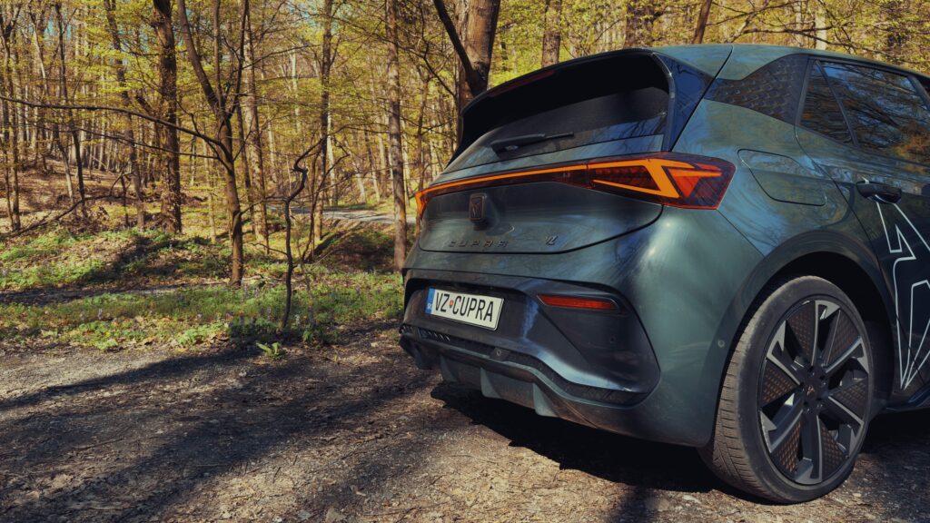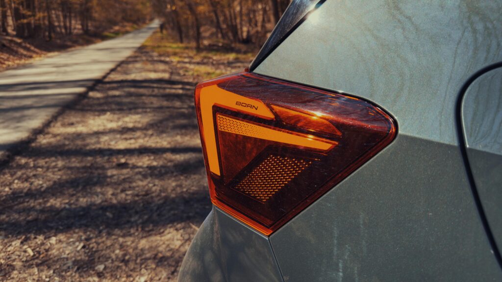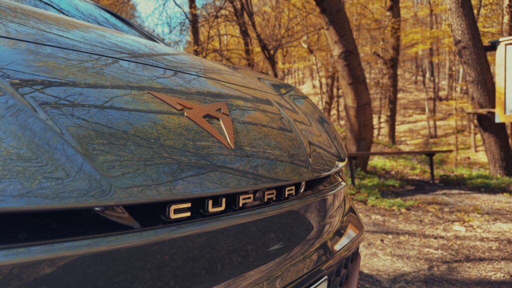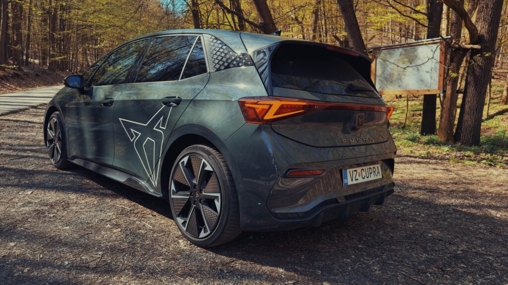 Cupra Born VZ vyžaruje dynamiku a energiu už na prvý pohľad. Jeho agresívne línie a ostro tvarované hrany jasne naznačujú, že ide o vozidlo navrhnuté pre tých, ktorí si potrpia na výkon a zároveň aj na dizajn. Farba nášho testovaného vozidla s názvom Forrest Green, dokonale zvýrazňuje krivky vozidla a odlišuje sa od ostatných farebných prevedení konkurencie. Predná časť vozidla je charakteristická zaoblenou maskou, ktorá pôsobí veľmi elegantne no zároveň dodáva autu športový vzhľad. Kapota je mierne tvarovaná a športovo ladená, no zároveň obklopená výrazným logom Cupra, ktoré je neprehliadnuteľne umiestnené v jeho typickej farbe – Copper.
